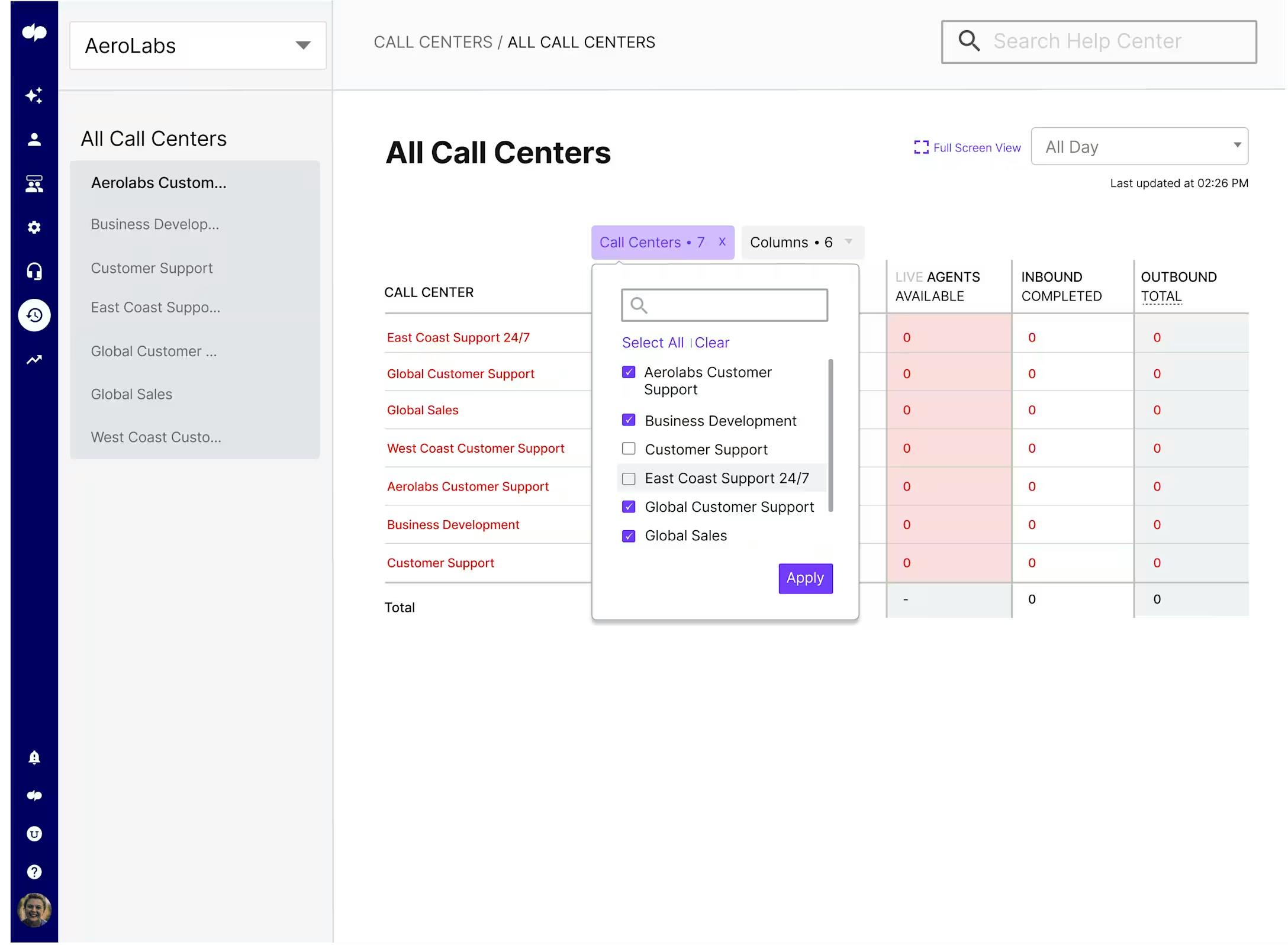 - Real-Time Dashboard: Live visibility into call volume, queue status, agent availability, and service levels with instant updates.